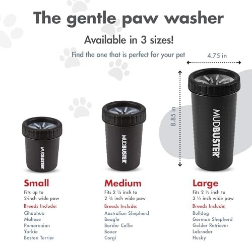 A: The Large MudBuster is designed for dogs with paws wider than 3 ½ inches. This typically includes breeds like Labradors, Golden Retrievers, German Shepherds, and Great Danes. If your dog’s paw is smaller than this measurement, the Medium or Small size would be a better fit for the dog paw washer to work effectively.