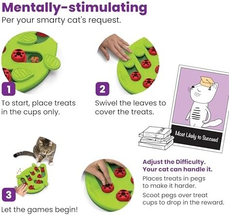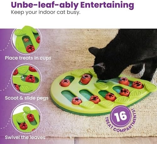 * Versatile Play Modes: The interactive elements—scootable pegs and swiveling leaves—offer multiple ways to play. This adaptability means the puzzle grows with your cat’s skill level. Beginners might learn to nudge the leaves aside, while advanced cats master the peg movement to access treats hidden deeper within the board.