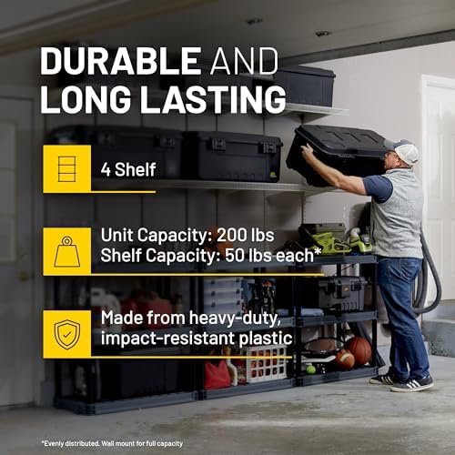 The most compelling aspect is its 200 lb capacity distributed across four shelves, allowing for substantial storage without fear of collapse. Each shelf can handle up to 50 lbs independently, which is impressive for a plastic construction. This capacity isn’t just a marketing claim—it’s backed by heavy-duty, impact-resistant plastic that can withstand accidental bumps and drops common in garage or workshop environments.