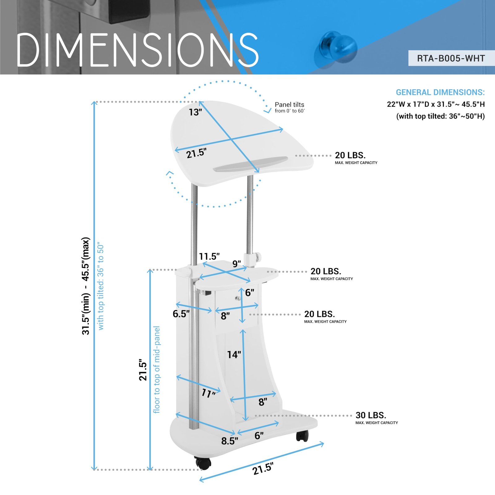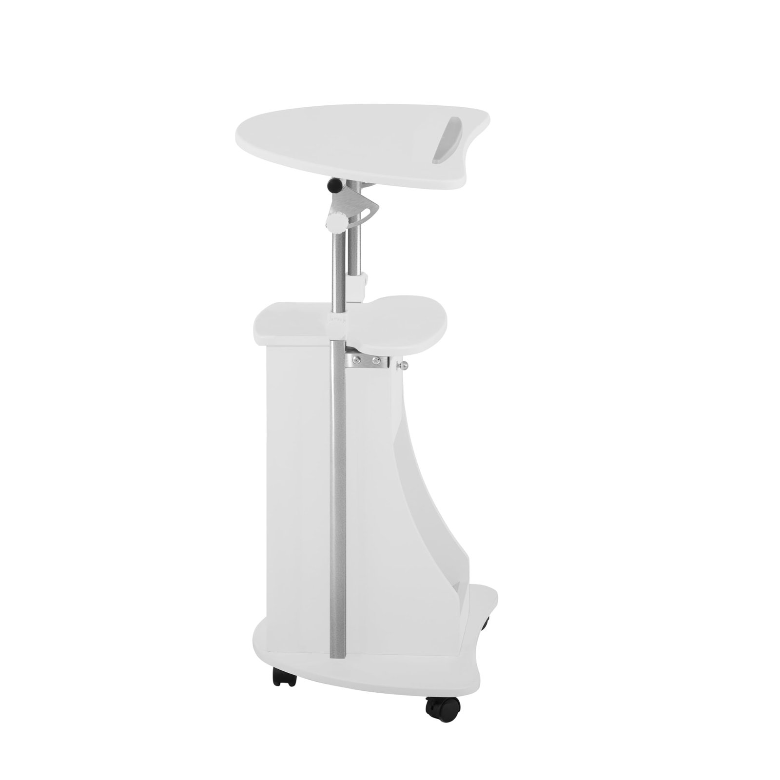 Optimize your workspace with the Techni Mobili Rolling Adjustable Laptop Cart, a versatile and ergonomic solution designed for maximum comfort and mobility. This durable laptop cart features a tilting main panel that adjusts easily to your preferred working angle, enhancing productivity while reducing strain. Equipped with safety edge-stoppers, it securely holds your devices and paperwork even when the panel is tilted.